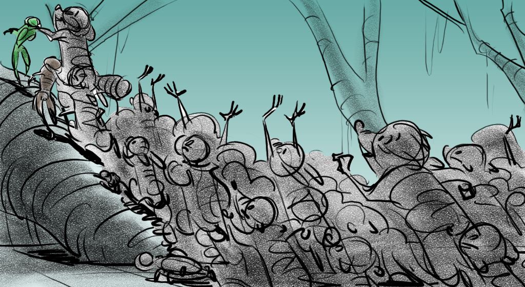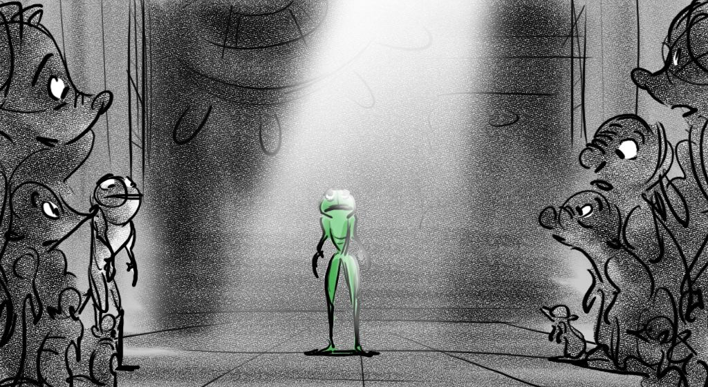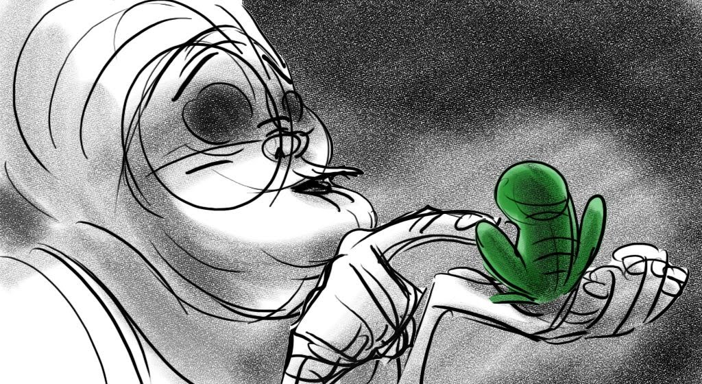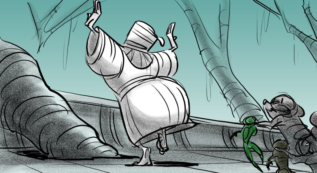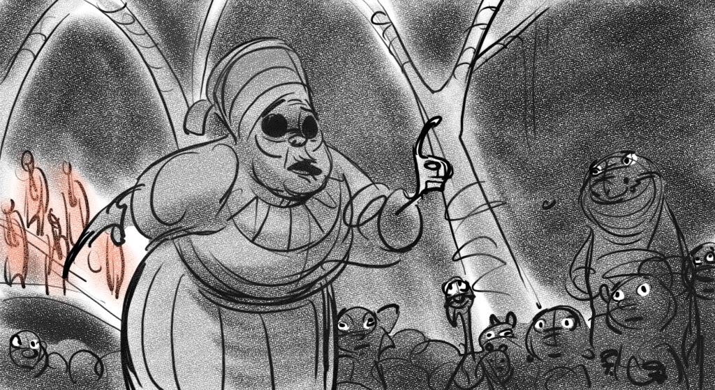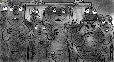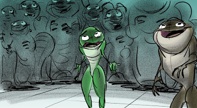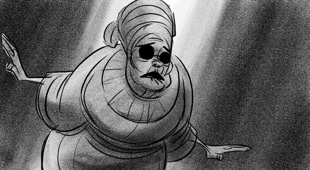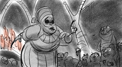 These sketches are from an early version of Mama Odie's song from Princess and the Frog. The song was originally a little gospel diddy called, Turn On The Light. Paul Briggs and I teamed up on the sequence depicting a "church service" in the black southern tradition with a choir of spoonbills in the background and various swamp critters acting as the congregation. The song was eventually rewritten as You Gotta Dig A little Deeper which ended up in the movie. Working with Paul was the highlight of my time on that movie.