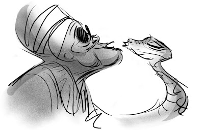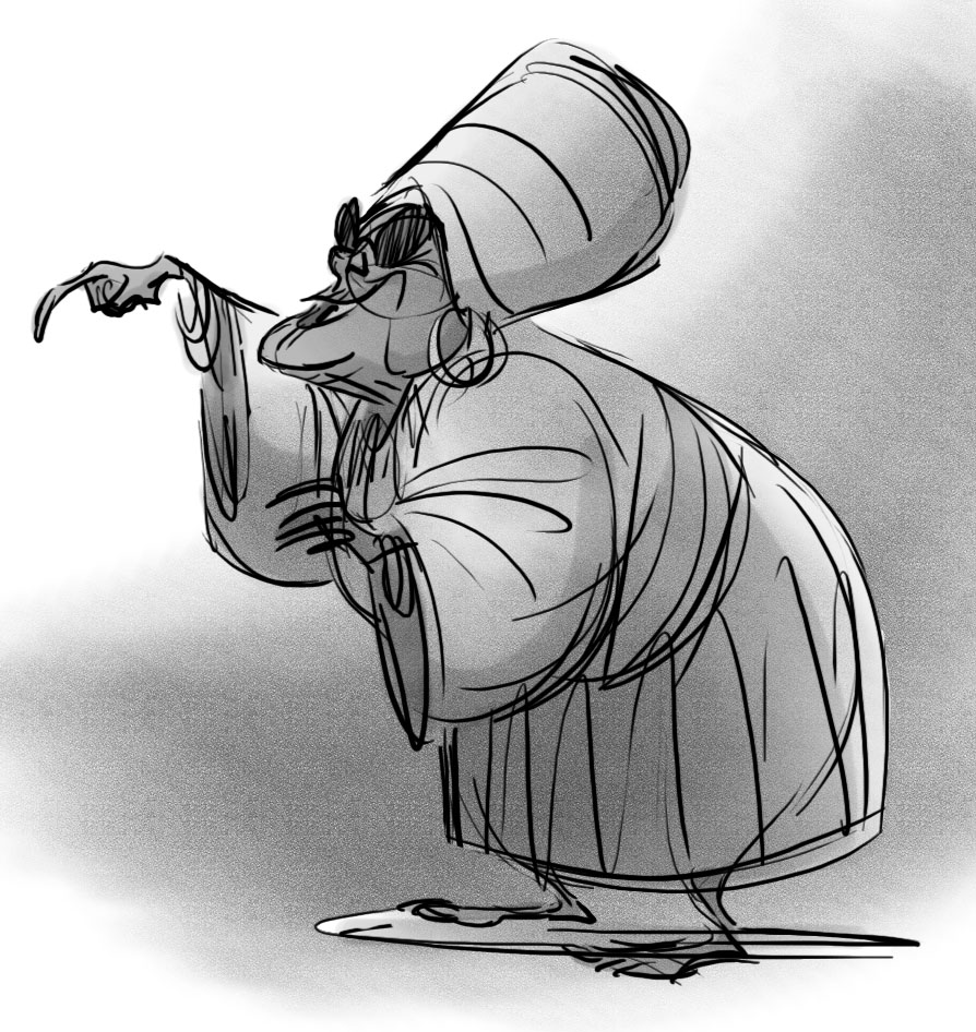 These are some rough explorations for Mama Odie the blind voodoo priestess in Princess and the Frog. My next post will be story sketches from an early incarnation of Mama Odie's song sequence.