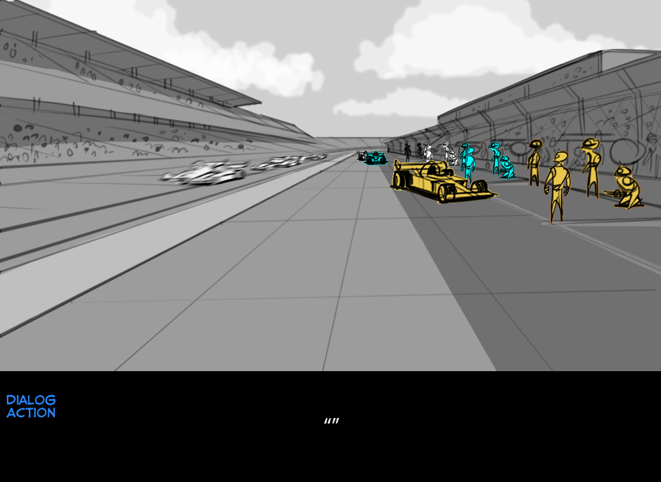 FYI - Some of the Indy cars in this scene are imported 3D models that I positioned on the track using Photoshop CS5 Extended. This saved me from having to draw a bunch of cars at crazy angles with a lot of foreshortening.