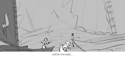 There were many permutations of this scene from early on in the story process. Some with Moana finding the cave on her own; others with Grandma Tala leading her to it. In this version, Grandma Tala leads Moana to the cave and enters with her, taking her on a tour of the relics of their voyaging past . Ultimately, in the final version, Tala would only lead Moana to the cave opening and stay behind.